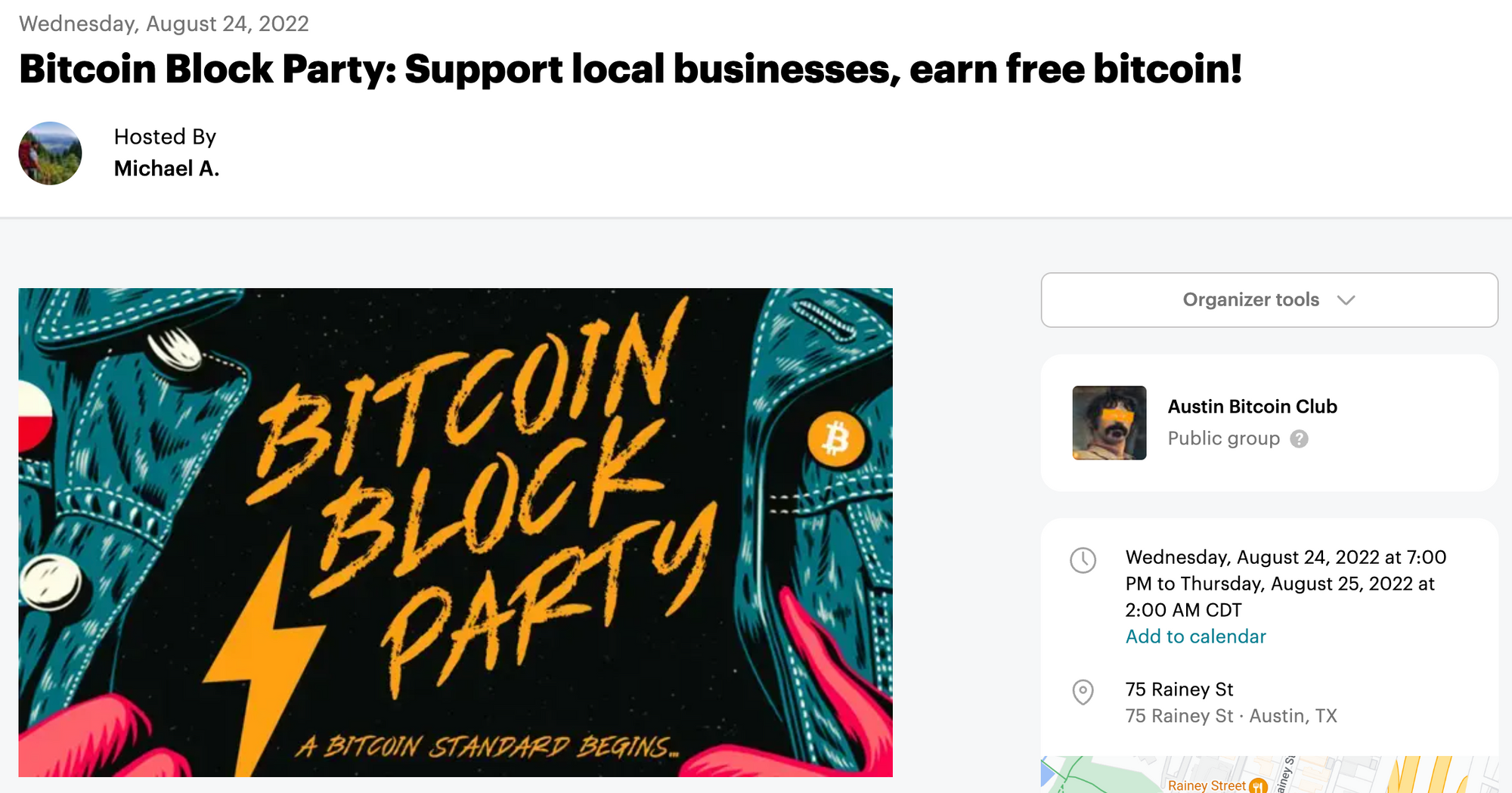💥BITCOIN BLOCK PARTY IS BACK💥Join us during @bitblockboom week as we gather once again to support #bitcoin accepting businesses in Austin.-Wednesday, August 24th-7PM-2AM-75 Rainey Streethttps://t.co/GupNEi5BmT— Michael Atwood (@Dooowta) August 8, 2022