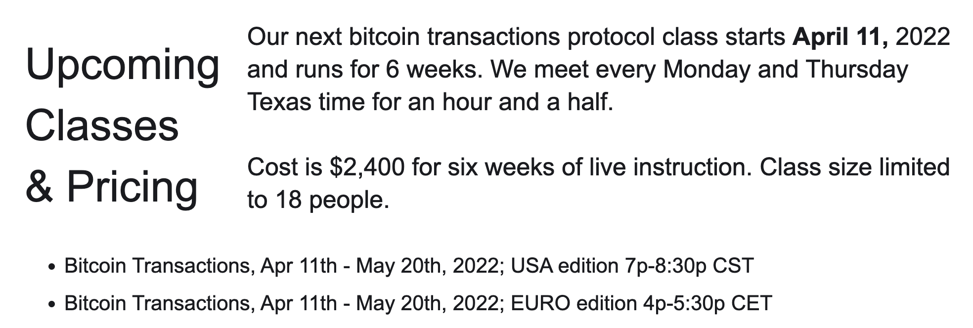 🤠 The bitcoin transactions protocol class starts April 11, 2022 and runs for 6 weeks. They meet every Monday and Thursday Texas time for an hour and a half.