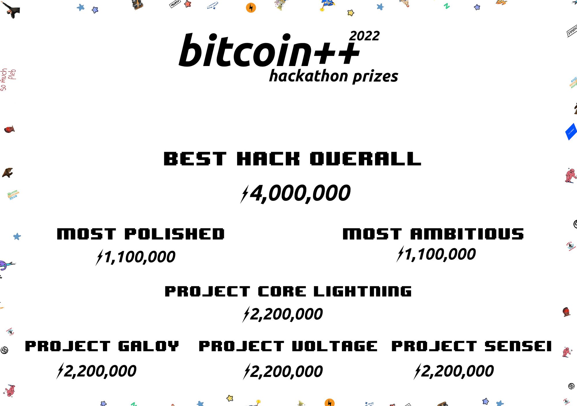 The categories were split up by Best Hack Overall provided by ⚡️PlebLab, Most Polished, Most Ambitious provided by Fulgur Ventures. Project Core Lighting provided by Base58⛓️🔓, Project Galoy provided by Galoy. Project Voltage by Voltage. and Project Sensei provided by Sensei.
