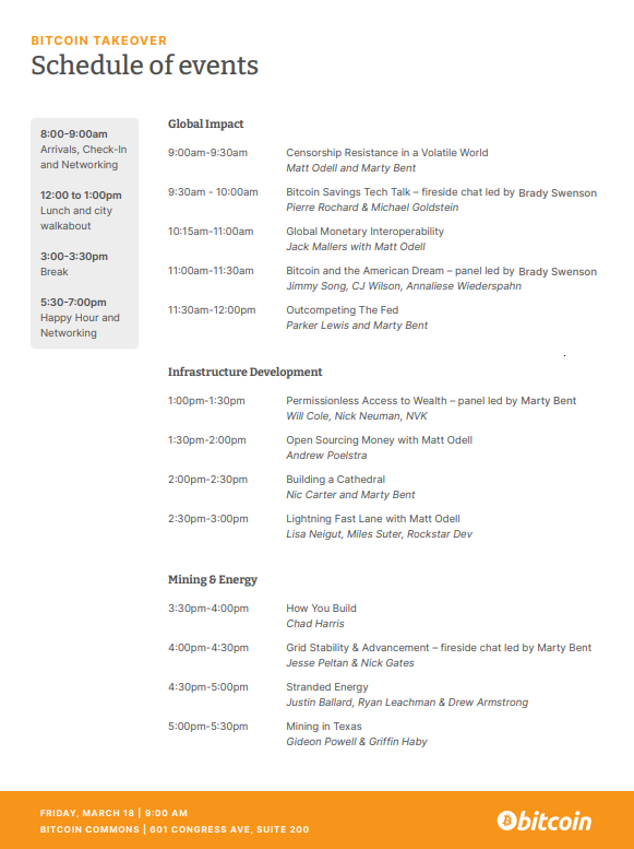 2/ The schedule for the #Bitcoin Takeover on March 18th has been finalized and we're looking forward to having all our speakers together to help educate a packed house at the Bitcoin Commons about why bitcoin is so critical to the world & the important work bitcoiners are doing. pic.twitter.com/kNWbOgyXaR— Parker Lewis (@parkeralewis) March 15, 2022