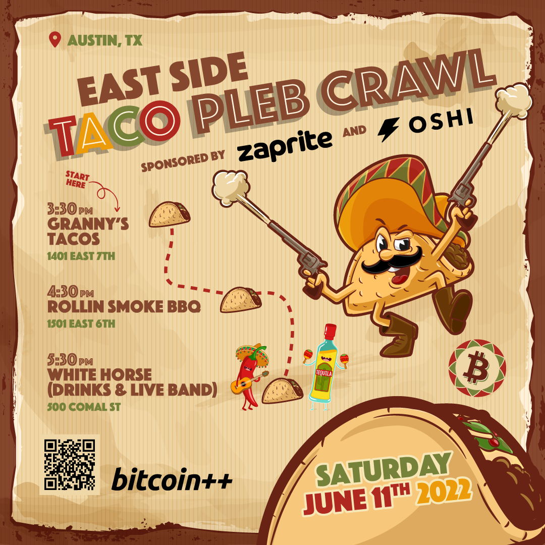💻 The hackathon portion of the conference on the 9th and 10th is being held at Bitcoin Commons where devs will be able to win up to ⚡️12 million sats. Plus a🥂🎉 closing party friday evening on the famous Rainey Street at The Tipsy Alchemist. The other cool side event happening the next day on the 11th is the first ever Taco Pleb Crawl brought to you by Zaprite and Oshi.