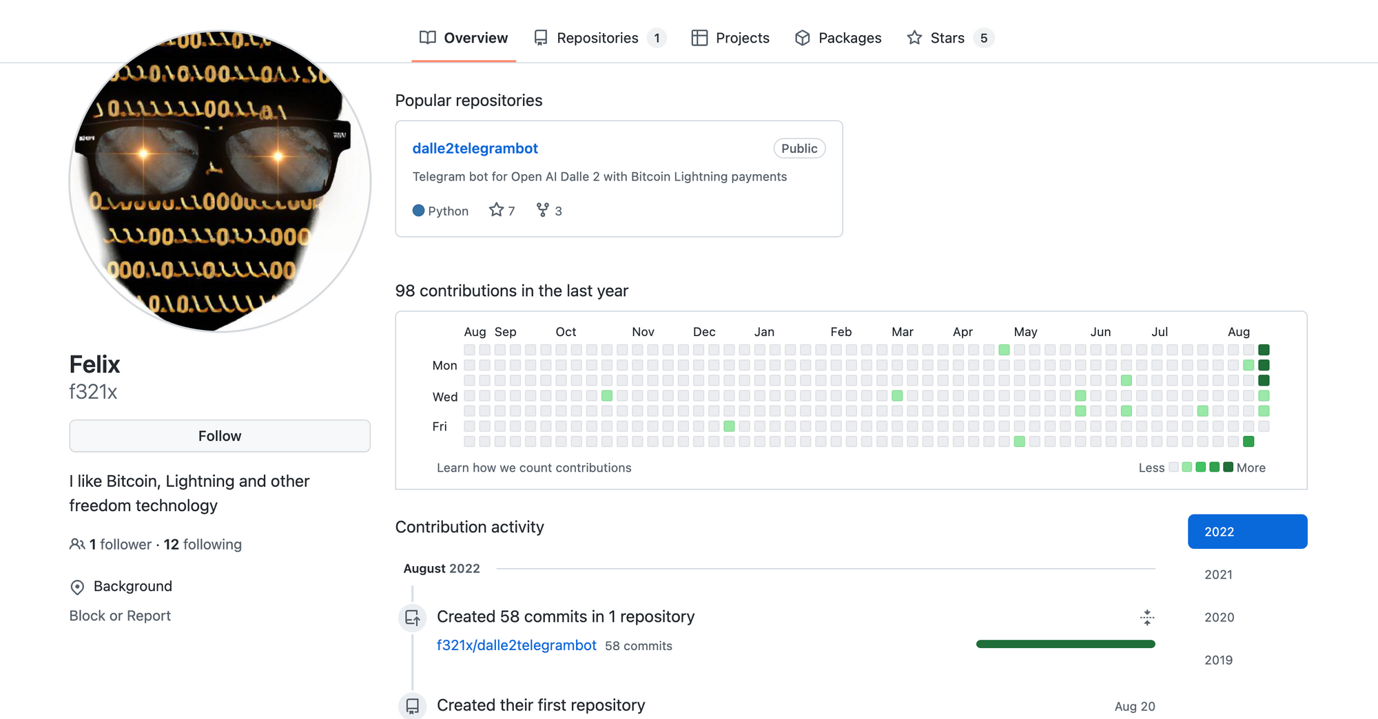Felix created his first code project, a Telegram bot making OpenAI's DALLE 2 available for anybody with lightning payments.