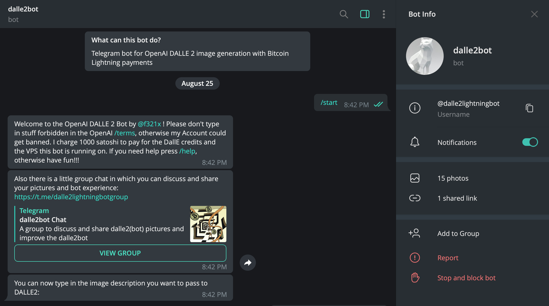 - You connect to the app via telegram with this address: https://t.me/dalle2lightningbot