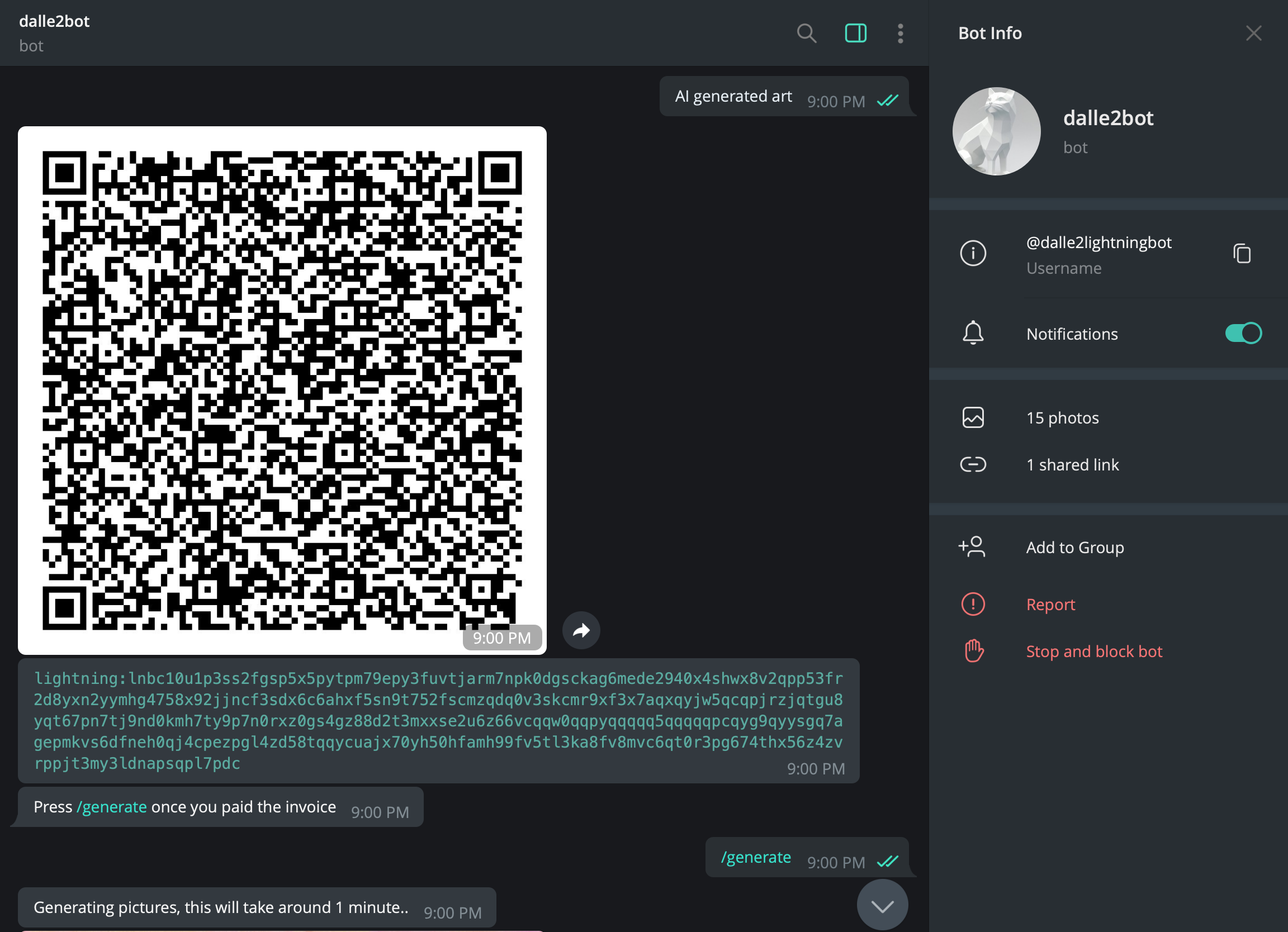3. dalle2bot will generate a lightning invoice, once it is paid dalle2bot generates the images using the Open AI Dalle 2 api, currently rn it is ⚡️1,000 per request.