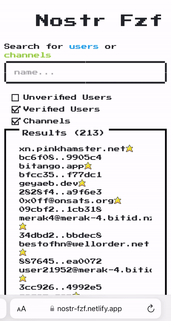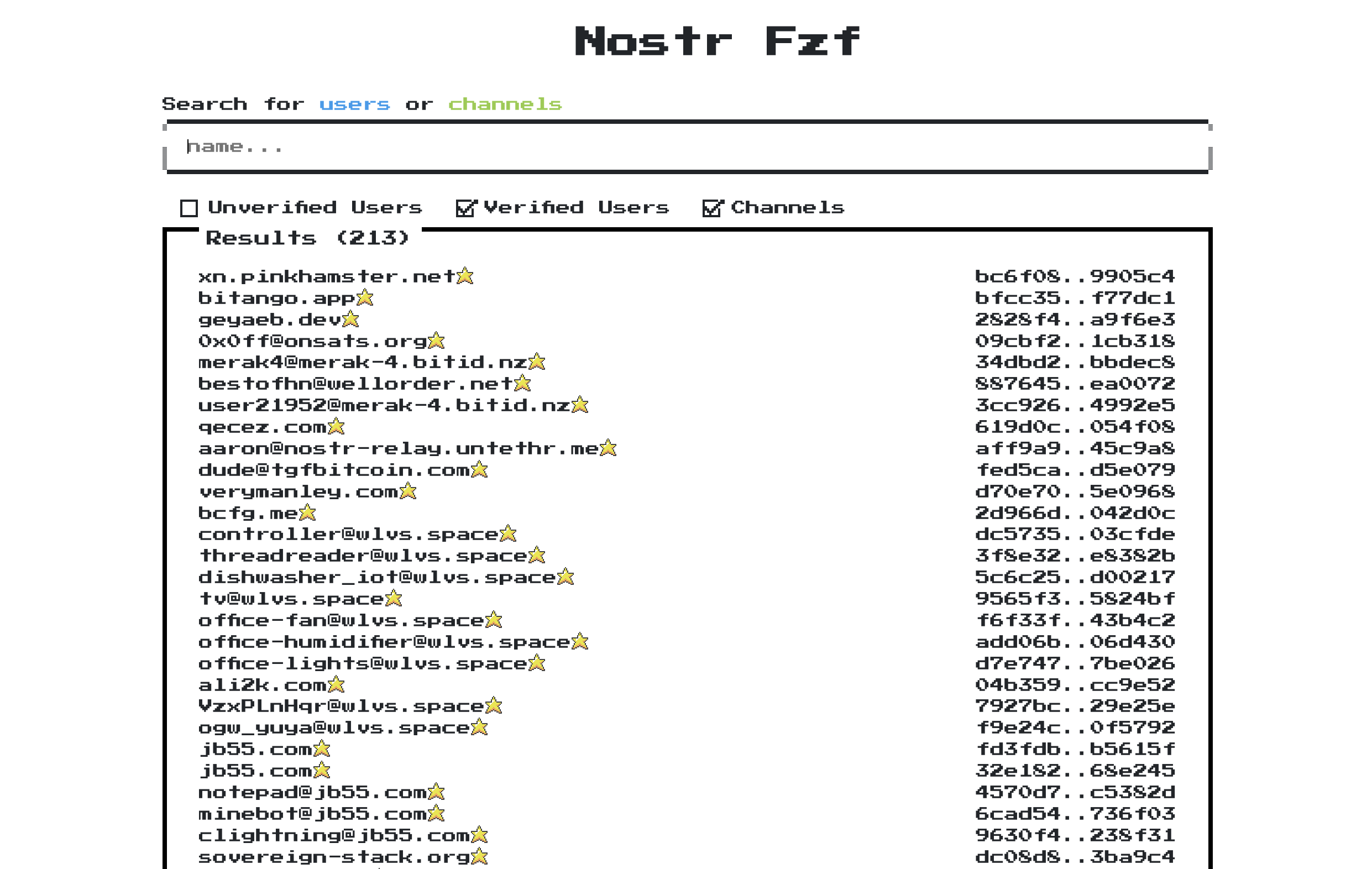 Nostr Fzfhas a nice searchy vibe to it. It even sports a fat mickey mouse pointer thats just too adorable. Nostr Fzfalso makes searching for your frens really easy as well with the option of selecting unverified users and verified users.