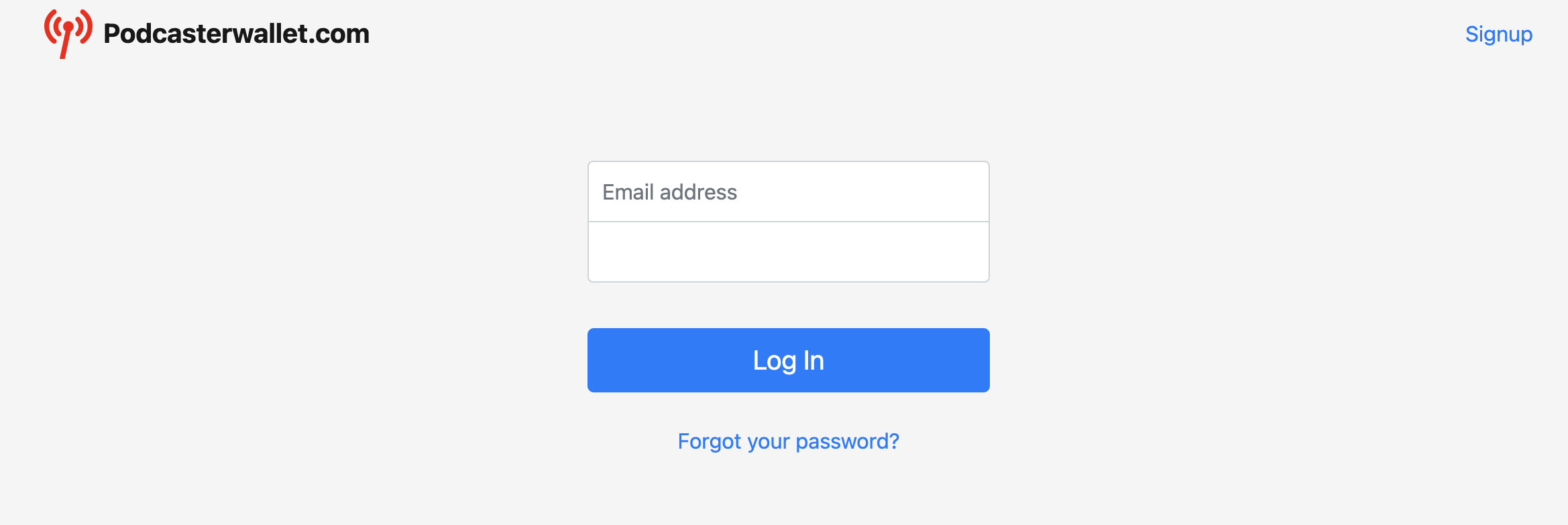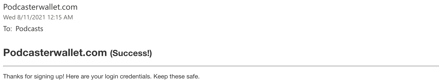 So this is where it gets tricky. Do not click on this link when this email comes in. This through me off a couple of times cause I kept clicking on it and tried signing up to create a login. Maybe its just me, but just wait shortly another 5 min and Podcaster Wallet will send you another email with your login and password for the site, see below.