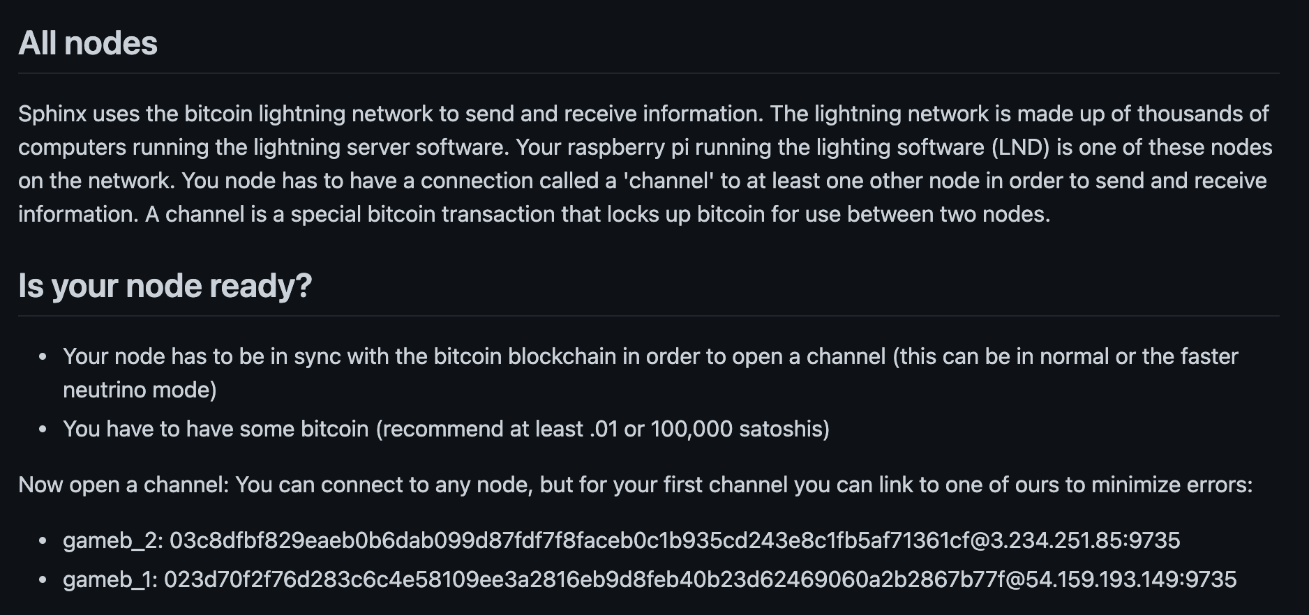 You will be sent over to the Sphinx Chat GitHub but what we want to do first is Open a Channel on our Lightning Node. When you get there scroll down until you see the following.