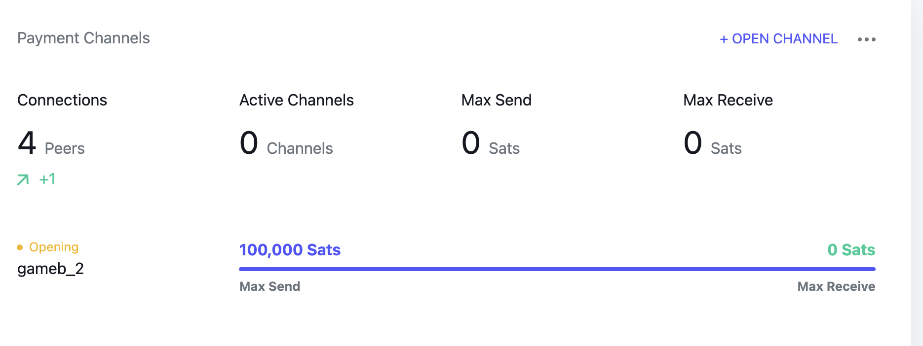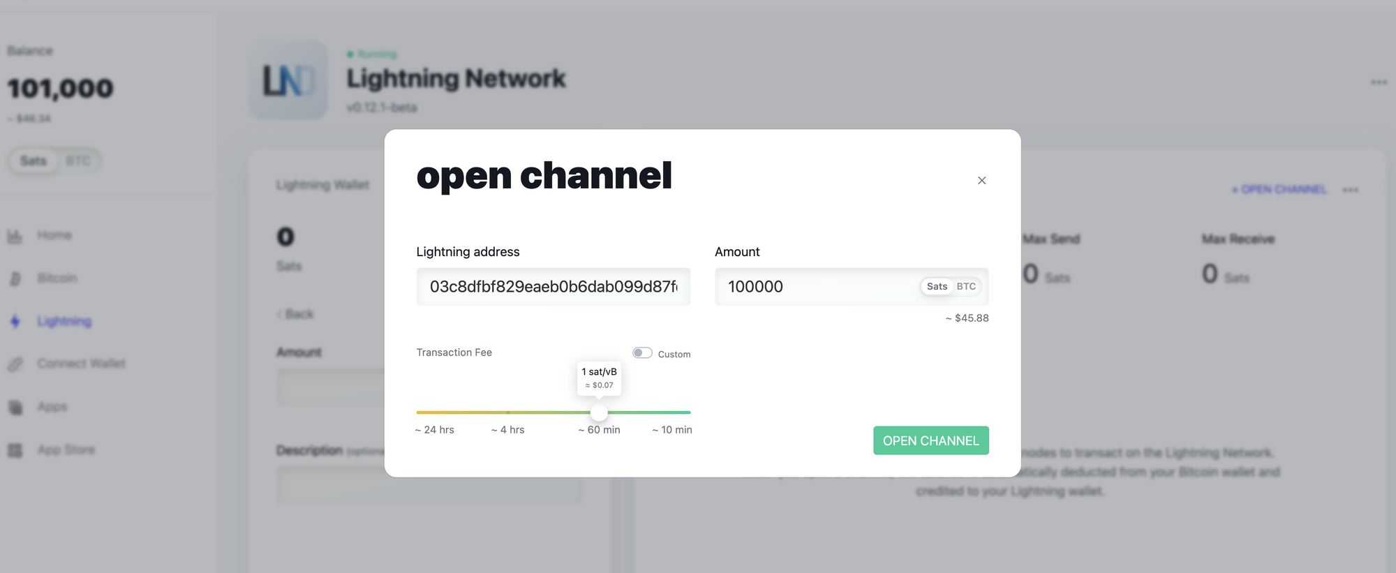 Next you want to click on the Lightning Wallet on your Umbrel and click on Open Channel. Paste either gameb_2 or gameb_1 to connect to Sphinx Chat, also set the amount to 100,000 Sats.