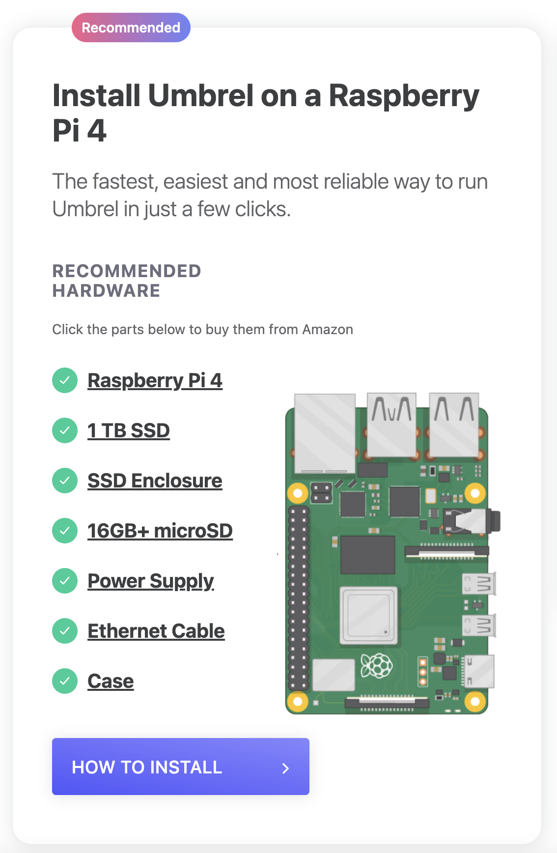 Umbrel has put together all the materials you will need so be sure to get this hardware then come back here, once your ready.
