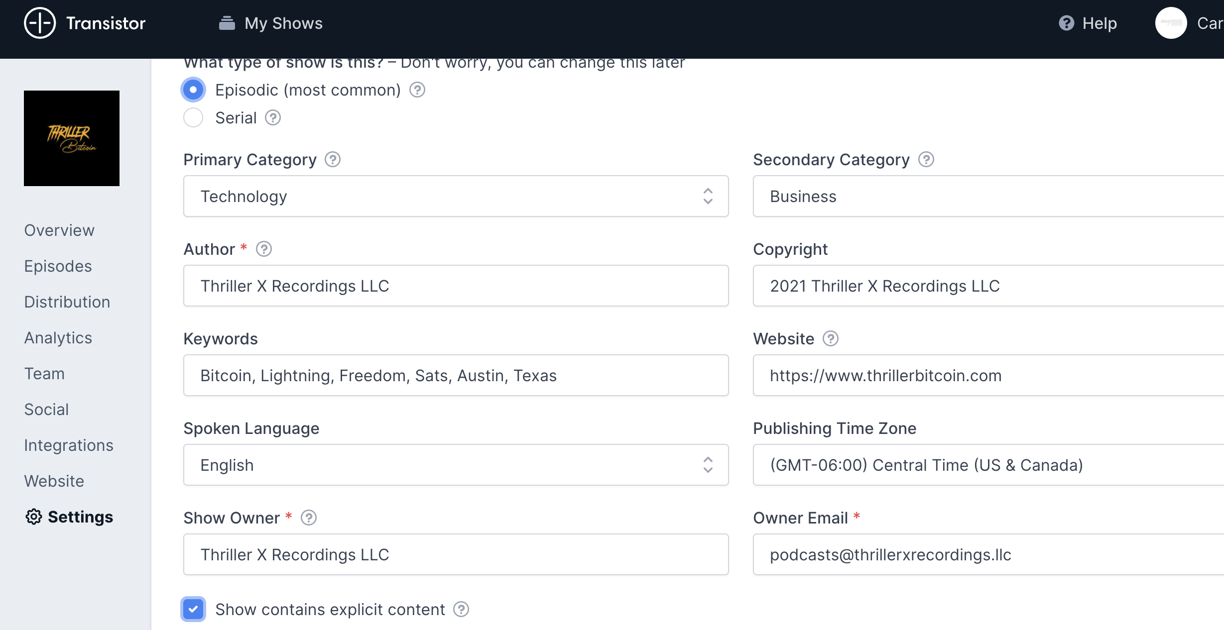 Go to your Podcast Host. If you are someone like me and use Transistor. You will login and then navigate to settings. This is important make sure to copy your email address for your podcast where it says owner email, for mine its at the bottom right.
