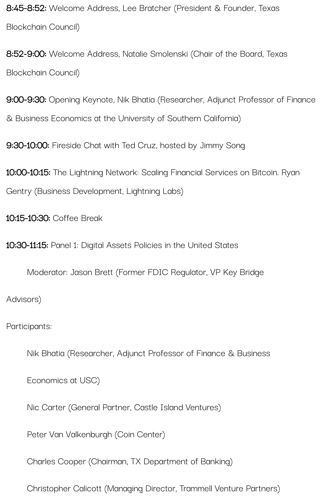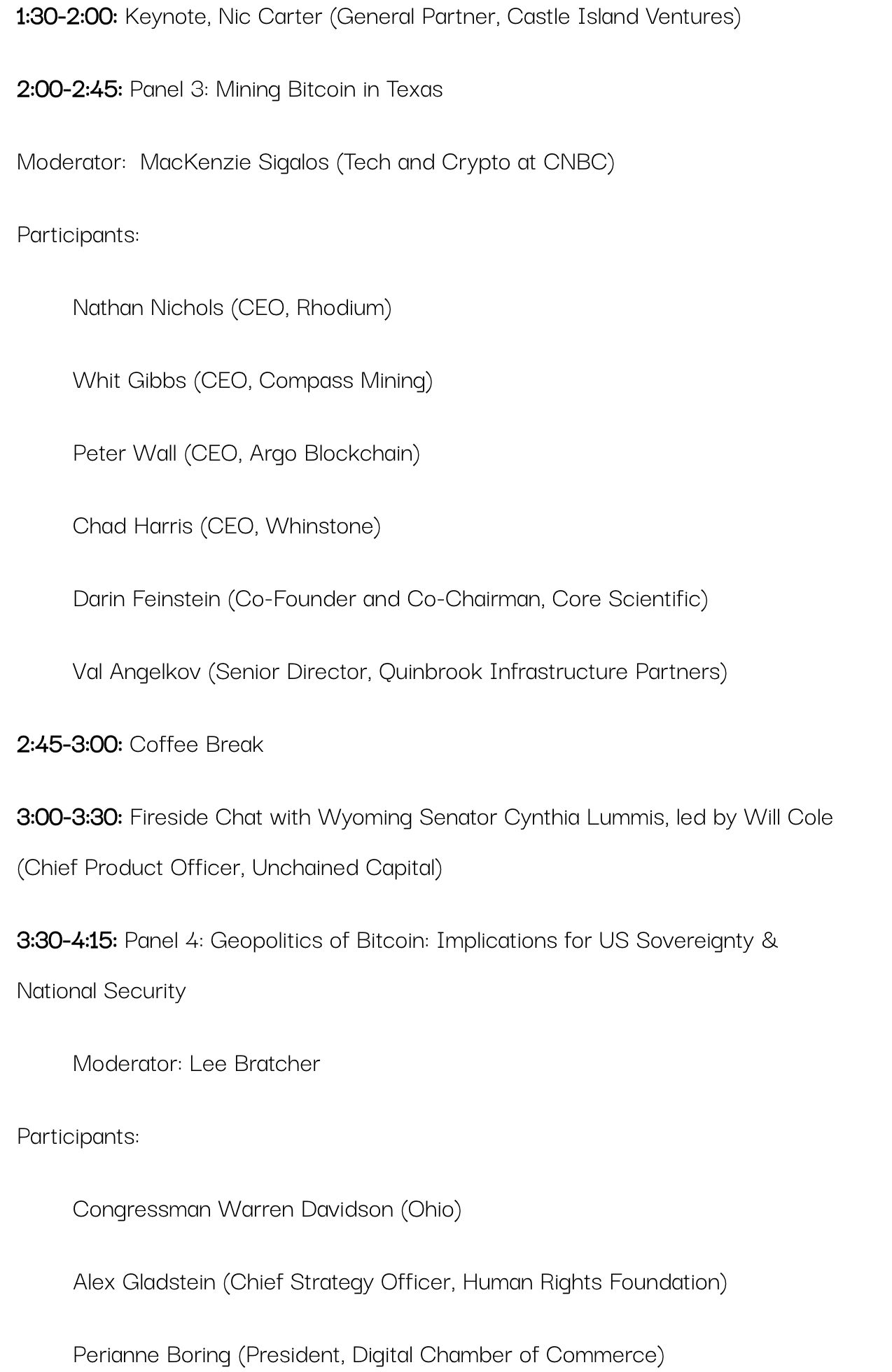 We also have an edge of your seat discussion on Mining Bitcoin in Texas which I'm sure most of the people in the room will be hanging on every single word. Also Wyoming Senator Cynthia Lummis will be in attendance as well.