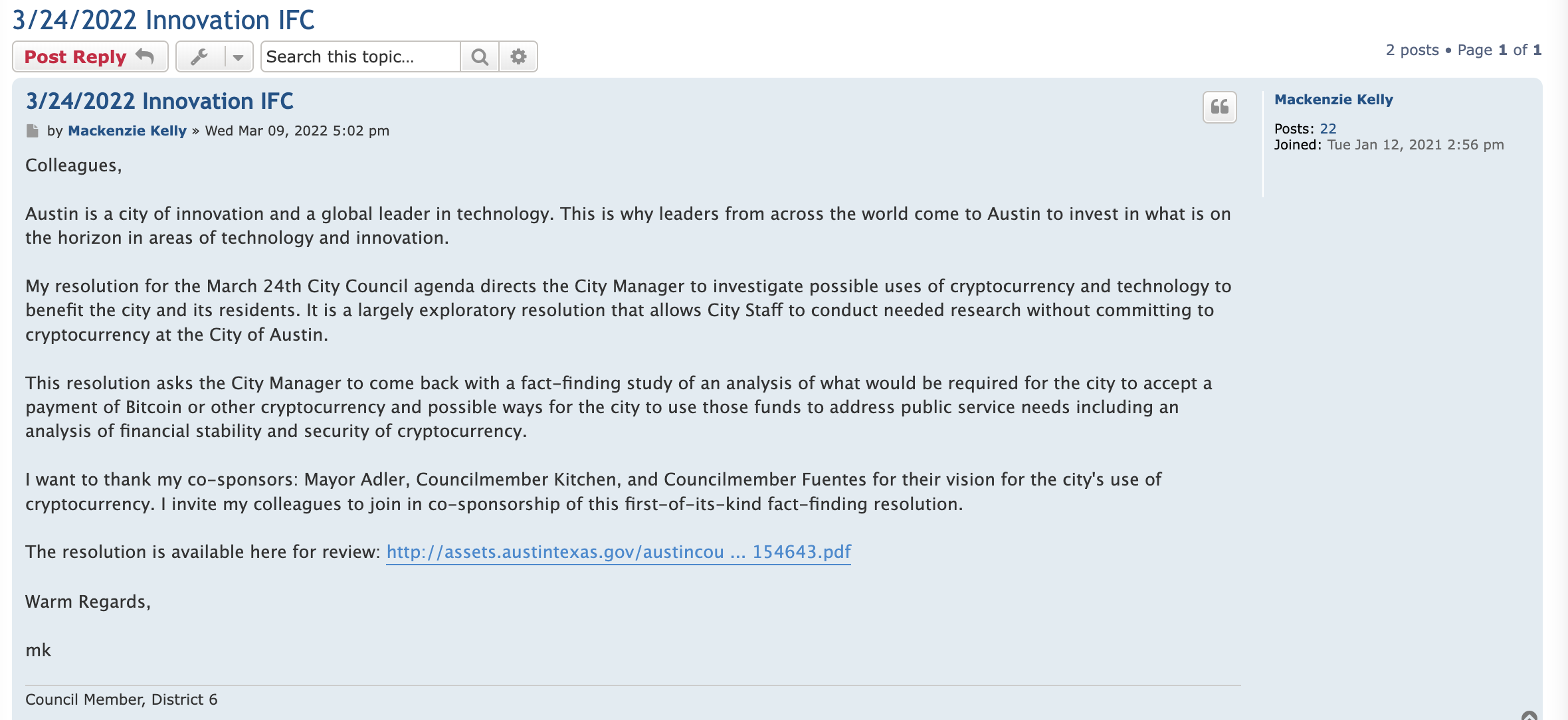 I don't think I even need to begin to explain why a new centralized cryptocurrency run by the government is a bad idea. We really hope that Adler's resolutiondoes not pass, and honestly I think that it may be time for him to move on from politics. Choosing centralized tokens owned by a private company for our city shows an inherent lack of judgement, and it looks like the pre-mentioned bitcoin candidate Mackenzie Kelly agrees with my sentiment