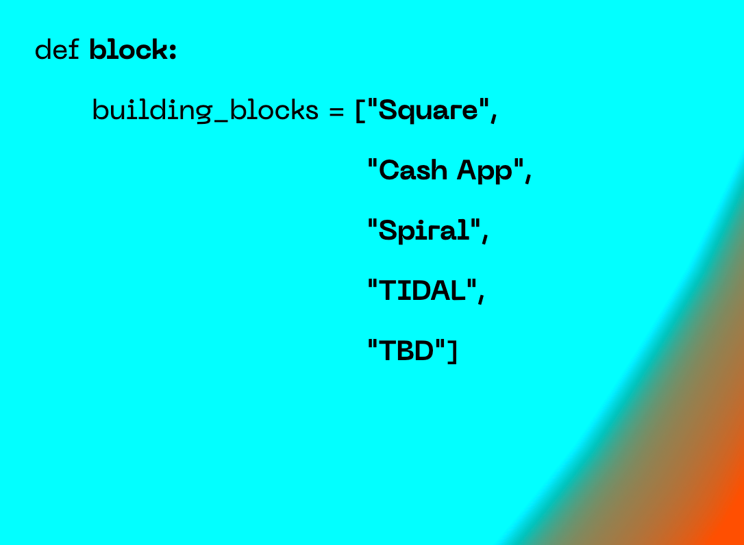 Square helps sellers run and grow their businesses with its integrated ecosystem of commerce solutions, business software, and banking services. With Cash App, anyone can easily send, spend, or invest their money in stocks or Bitcoin. Spiral (formerly Square Crypto) builds and funds free, open-source Bitcoin projects. Artists use TIDAL to help them succeed as entrepreneurs and connect more deeply with fans. TBD is building an open developer platform to make it easier to access Bitcoin and other blockchain technologies without having to go through an institution.